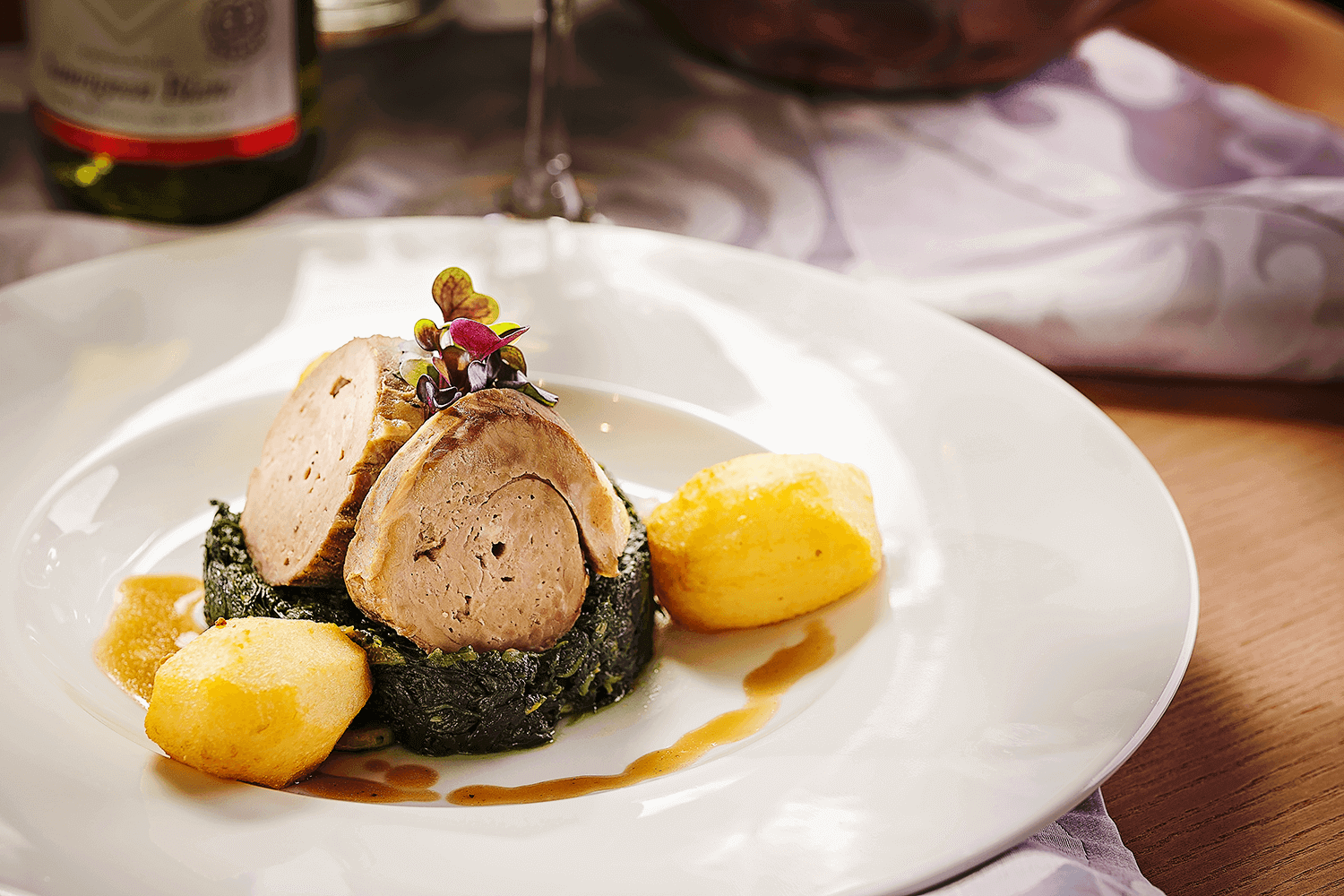 Jahňacie plece opracujeme, orezky z mäsa zomelieme, dochutíme bylinkami, soľou a korením. Naplníme mäso a zrolujeme do fólie. Takto pripravevé rolky dáme do Alto Schaum a tepelne upravujeme 12 hodín - metóda ,,sous vide“. Hotové mäso zašokujeme a zachladíme. Roládu pred podávaním ohrejeme aj s omáčkou vo vývare ešte vo vrecku. Mäso vyberieme, opečieme na rozpraženom masle a podávame s maslovým špenátom a rozmarínovými zemiakmi.