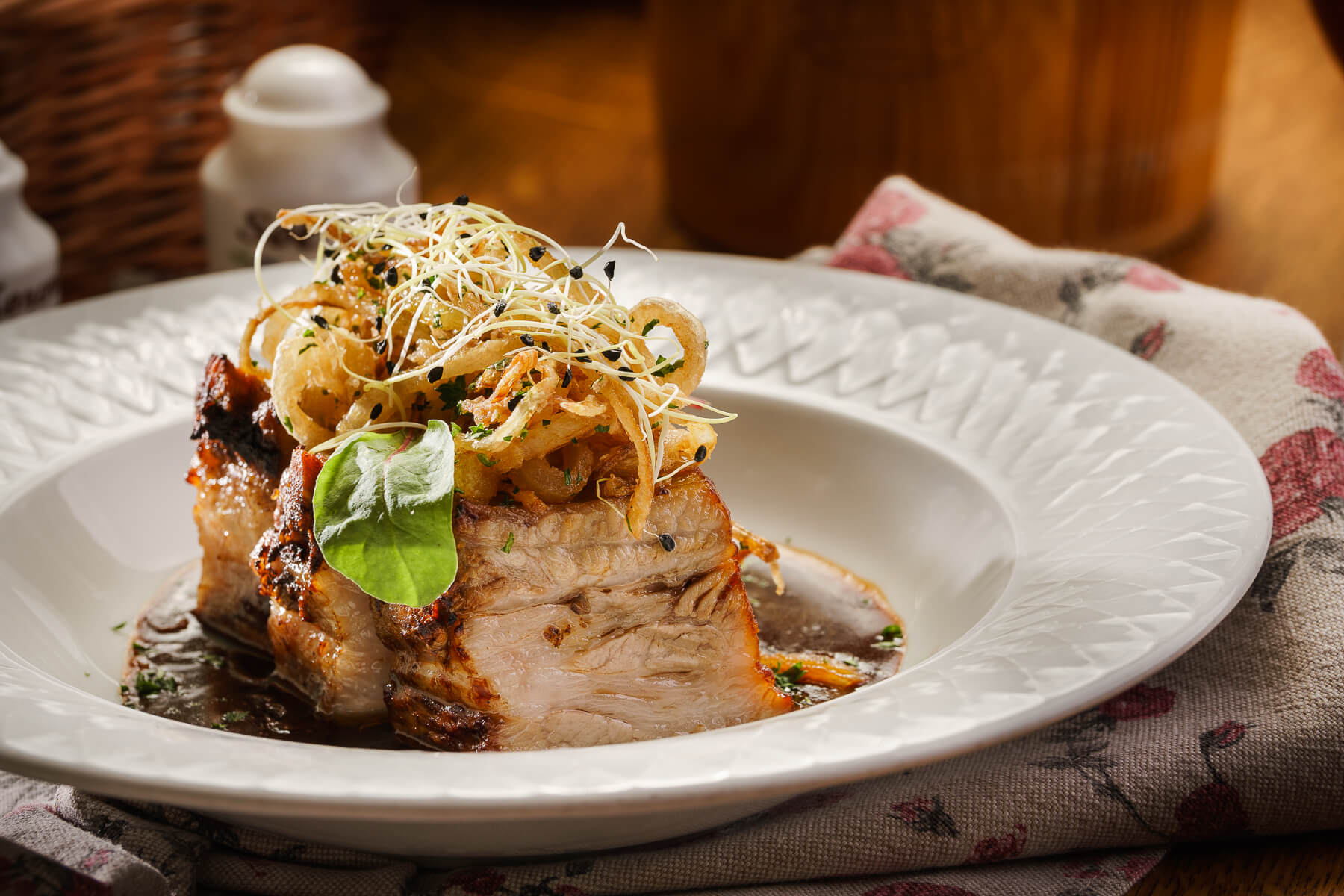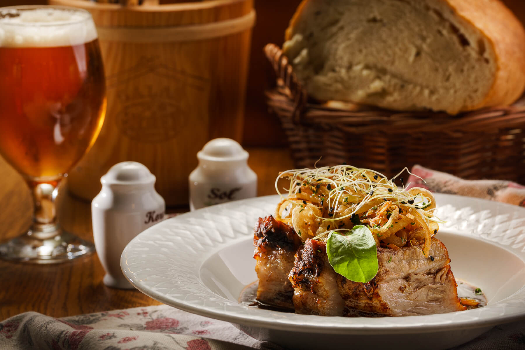 Rebierka nakrájame a pripravíme marinádu z cesnaku, medu, oleja, soli a korenia. Na plech uložíme rebrá, potrieme marinádou a podlejeme vodou. Pečieme prikryté 1 hodinu pri 180°C. Z výpeku pripravíme omáčku. Orestujeme pretlak a zalejeme výpekom, zahustíme gustinom. Dochutíme soľou a korením. Cibuľku nakrájame na kolieska, obalíme v múke a fritujeme. Podávame s chlebom.
