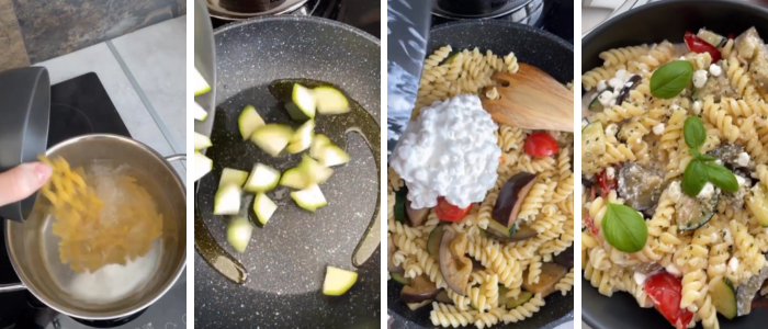 Cook the pasta in boiling water. If you want the water to boil faster, cover the pot with a lid. Salt the water after it has boiled. This will prevent white spots on the bottom of stainless steel pots. Put the oil and the chopped vegetables in the heated pan. Add the tomatoes last. Season and stir in the cooked and drained pasta. Finally, stir in the cottage cheese. The pasta salad can be garnished with a fresh basil leaf or an oregano leaf.